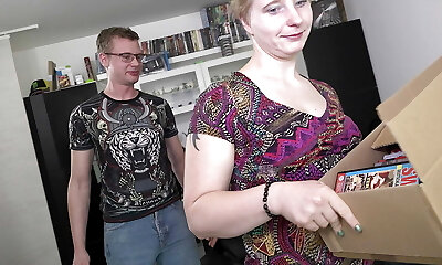 Package delivery man gives his customer fine pleasure with his horny mound and comes aggressively in her cootchie